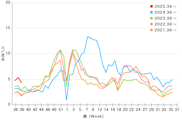 ▼定点医療機関当たり患者報告数(2025年9月21日(第38週)まで)