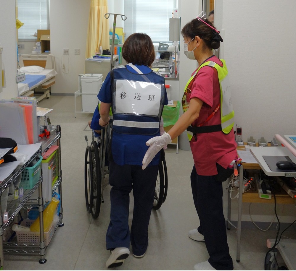 動けない患者さんや重症患者さんを安全かつ迅速に避難場所へ運ぶための搬送手順を確認しました。