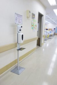 非接触型体表面温度計付きエミックオートハンドディスペンサーは、本館北出入り口、本館理学療法室、東館通所リハビリ、北館2階・3階・4階に設置致しました。