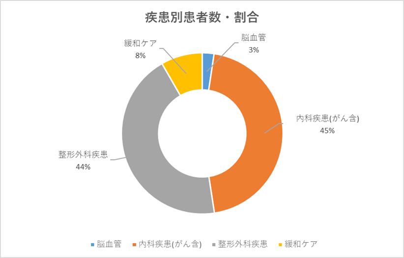 2023年の移転移行、リハビリ対象患者は増加傾向ですが、特に、整形疾患対象者が増加しており、2025年度は、内科系の疾患とほぼ同じになりました。